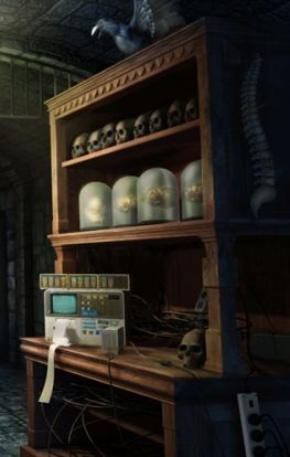 Was jedoch auffällt, sind die vielen Totenschädel im Regal und die Wirbelsäule