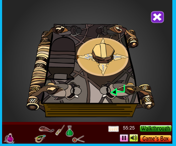 Diese habe ich in ihrer Reihenfolge (1 - 4) jeweils durch anklicken des Mistkäfers/Skarabäus(?) unten links rote Markierung in eine Position zwischen unteren li und re. Käfer( gelb) gebracht . Also 1 nach unten, dann mit dem re. Käfer/Enter gelbe Markierung bestätigen. Symbol 1+2 kamen hintereinander . 3+4 waren vertauscht . Da also so lange nach der 2 drehen mit rot bis die 3 unten ist bestätigen und dann die 4 und bestätigen mit Enter Käfer.